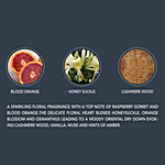 Cashmere wood, Vanilla, Musk, AmberHoneysuckle, Orange Blossom, OsmanthusRaspberry, Sorbet, Blood Orange