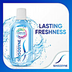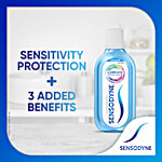 Sensodyne has designed and formulated an entire range of paste, brush and mouthwash to help protect people against tooth sensitivity while still providing the benefits of strong enamel, cavity protection and fresh breath. Using Complete Protection+ mouthwash in addition to brushing provides ongoing, round-the-clock trusted protection against tooth sensitivity. Alcohol free formulation ensures a pleasant experience and offers protection from acid wear to maintain strong teeth. The formulation contains fluoride for cavity protection & Cool Mint flavour to give lasting freshness.