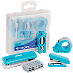 Elevate your workspace with the Kangaro Stationery Set DE Mini 10 - a compact and colourful collection of essential office supplies. This versatile set includes a stapler, paper punch, scissors, tape dispenser, and a variety of writing implements, all designed to simplify your tasks and boost your productivity. The removable chip tray on the mini punch and the ergonomic finger grip on the tape dispenser ensure effortless use, while the durable alloy steel and plastic construction promise long-lasting reliability. Whether you're a student or an office professional, this compact set is the perfect companion, offering a wide range of tools in a portable package. Customise your gift sets upon request and enjoy the convenience of this all-in-one stationery solution, ideal for both home and office environments.