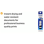 Experience seamless compatibility with a range of Epson Printer Models: L3110, L3101, L3150, L4150, L4160, L6160, L6170, L6190. Our black ink ensures instant-drying and water-resistant documents, delivering superior business-quality prints. Safeguard your printer's longevity and investment with Epson's trusted technology, boasting a page yield of 1500. The special feature of water resistance adds an extra layer of durability. Choose Epson for lasting quality and performance.