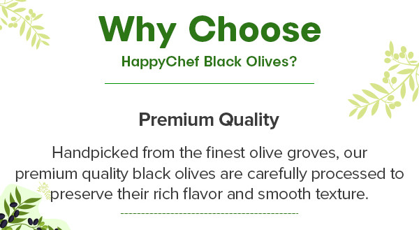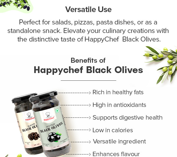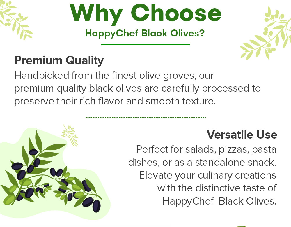 About the productHappyChef Pitted Black Olives are a delicious and versatile addition to any meal. These premium-quality black olives are carefully selected and packed in a 2.5% brine solution to preserve their natural flavour and texture. Enjoy them as a topping on pizzas, salads, or sandwiches, or simply as a tasty snack. With their rich, earthy taste and firm, meaty texture, HappyChef Pitted Black Olives are a must-have for any olive lover.