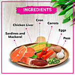 Sardine, Mackerel, Eggs,Corn gluten meal, Whole grain cereals, Vegetables, Soya refined oil, Fish oil, Wheat flour, Taurine, Vitamins (Vit A, Vit E, Vit B Vit B Vit B, Vit B??, Choline, Niacin, Folic acid) Organic minerals (Zinc, Iron, Copper, Selenium, Manganese) Prebiotics & Probiotics.