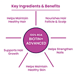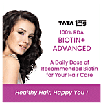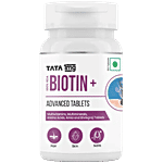 Tata 1mg Biotin Plus 100% RDA Tablet for Hair Care. Tata 1mg Biotin + advanced Tablet vital nutrient that helps promote growth and helps maintain healthy hair. It helps support hair follicles and hair strength. It can help your body convert protein, fat, and carbohydrates into glucose energy to promote a better functioning metabolism. It can be used as nutritional supplementation for dietary shortage or imbalance, which may cause hair loss or total alopecia, brittle nails, skin rash in infants, and mild depression. It supports hair growth and maintains healthy hair. It is also helpful in strengthening nails by reducing brittleness.