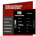 The cordless Metallic Beast Trimmer is the ultimate trimmer for men, featuring 2 magnetic heads for beard, nose, ears & body. This men's trimmer is IPX6 waterproof, perfect for the shower. With stainless steel blades, LED battery display & USB Type-C fast charging, it gives 90 mins runtime on 2-hour charge—outperforms any regular razor.