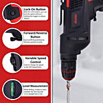 The Agaro ED2103 650W Corded Electric Drill is ideal for both home DIY and professional use. With a powerful 650W motor, it offers variable speed control up to 3300 RPM and operates in both forward and reverse directions. Its compact, lightweight design features an insulated, shock-proof plastic body and a convenient lock-on button for enhanced control and safety. Available in red and black colour.
