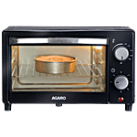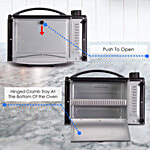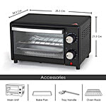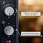 Adjustable temperature from 100‚°C to 250‚°C. Adjustable timer up to 30 minutes. Hinged crumb tray at the bottom. Capacity: 9L, Power: 800W. Heat resistant tempered glass window. Automatic Thermostat I Auto Shut Off I Ready Bell. Includes: Main unit, bake pan, tray handle, oven rack.