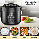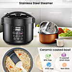 Regal Electric Rice Cooker - Ceramic Inner Bowl, Black. Cooks up to 600 gms of raw rice. Comes with a stainless steel steamer, preset cooking functions, preset timer, keep warm function, and LED display.