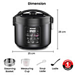 Features 5 preset rice cooking functions: white rice, brown rice, low-carb white rice, low-carb brown rice, and short grain. Offers 3 multi-cooking functions: porridge, steam, and slow cook. Advanced fuzzy logic technology automatically adjusts temperature and cooking time for optimal results. 24-hour preset timer; 12-hour keep warm function. Power: 500W, 230V/~50Hz. Includes inner bowl, stainless steel steaming basket, rice measuring cup, rice spatula, and soup ladle.