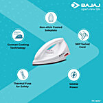 Boasting an innovative German Coating technology, the BAJAJ MajestyDX6 Majesty Dry Iron ensures an effective ironing performance. And, this sophisticated coating technology ensures that this iron glides smoothly over your fabric, leaving a pristine finish behind.