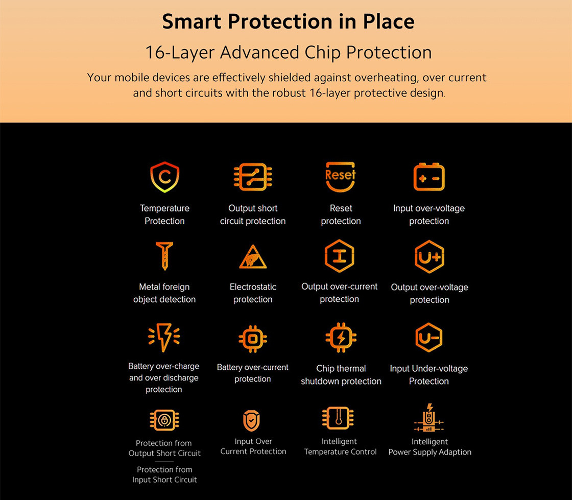 This power bank offers 16-layer enhanced chip protection which includes safeguards against overheating, overcurrent, short circuits, and more. Moreover, with features like temperature protection, input over-voltage protection, and intelligent temperature control, your devices are always shielded from potential hazards.