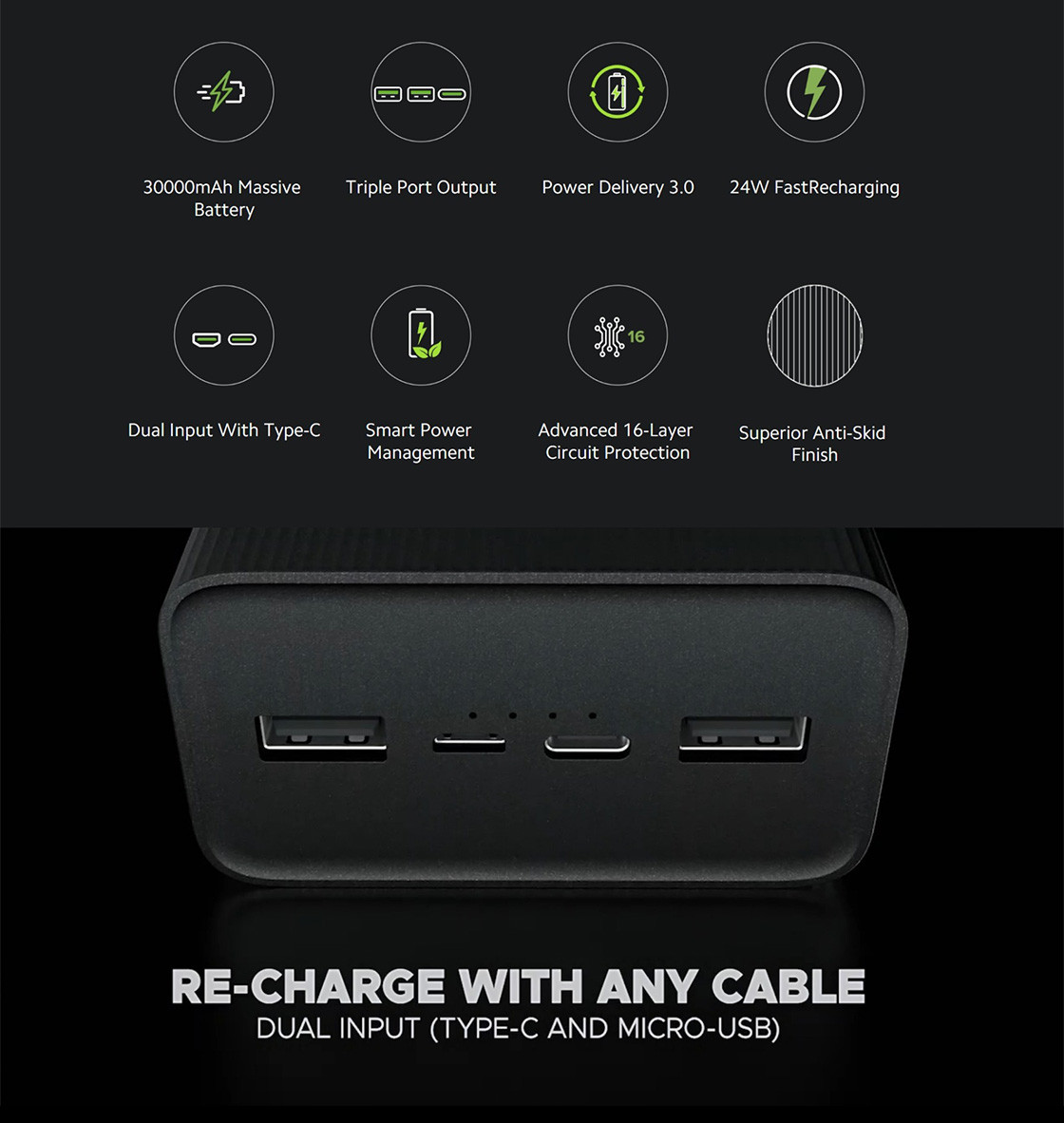 Recharging this power bank is quick, thanks to the 24W PD 3.0 technology. Moreover, you can fully recharge the 30000mAh battery in just 7.5 hours using a Type-C to Type-C cable, minimising downtime and keeping you powered up.