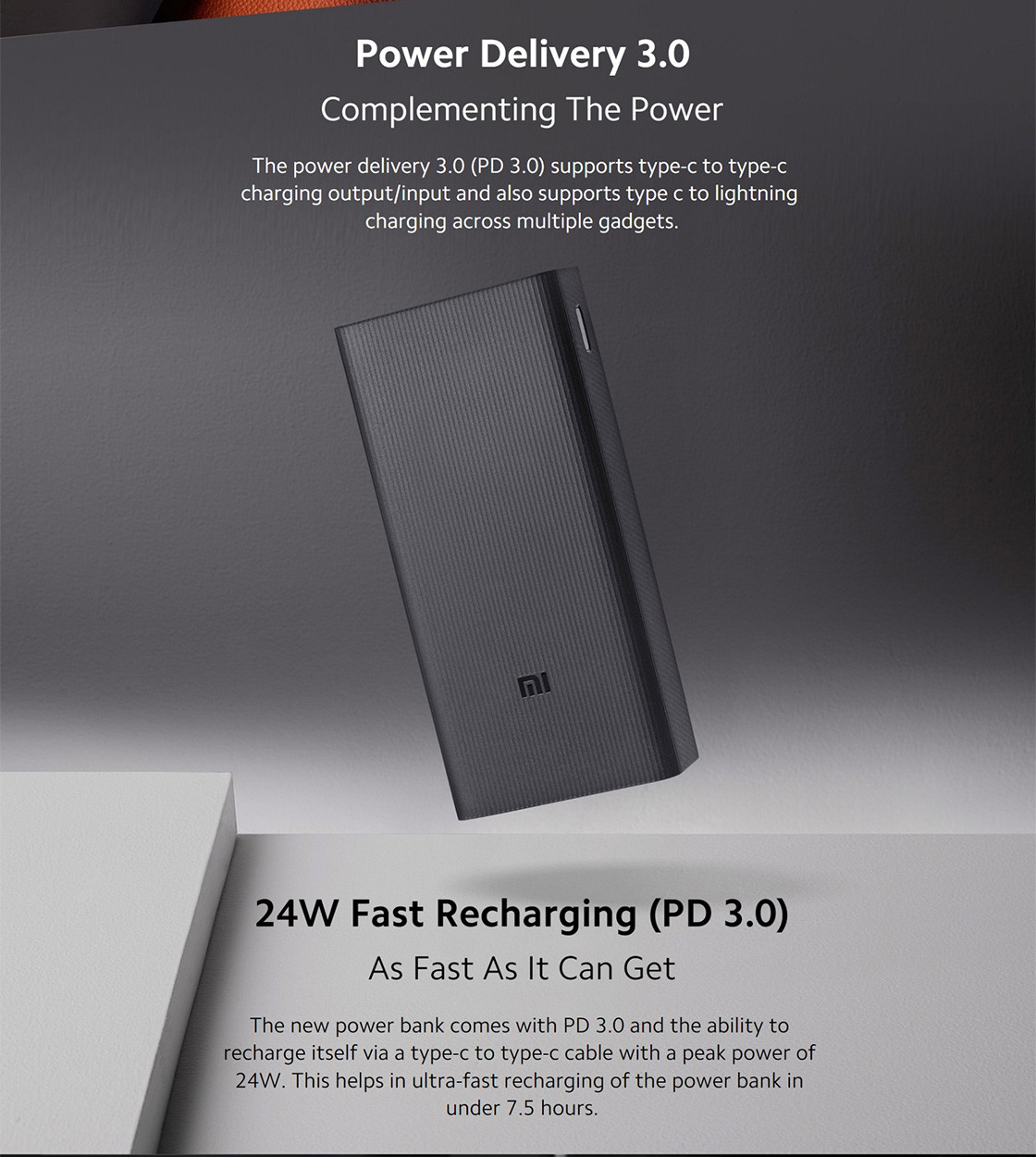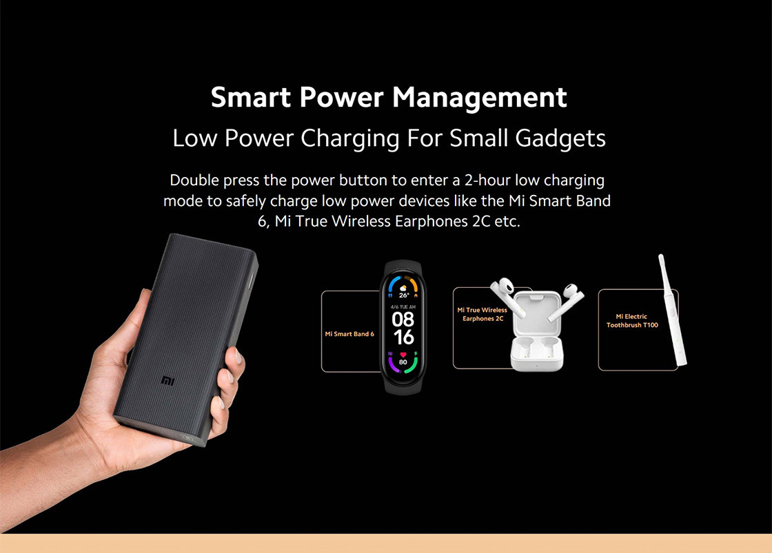Featuring a smart power management system, this Mi power bank includes a 2-hour low charging mode for small gadgets like the Mi Smart Band 6 and Mi True Wireless Earphones 2C. Thus, you can simply double-press the power button to activate this mode.