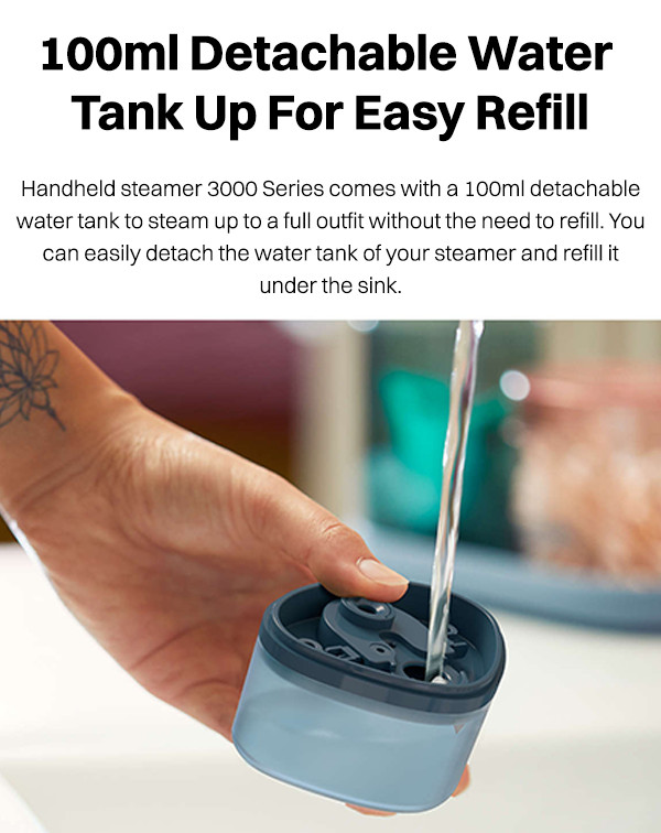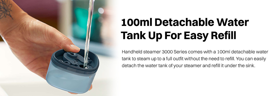 Built with a 100ml detachable water tank, this steamer provides enough capacity to steam a full outfit without the need for constant refills. When it's time for a refill, you can simply detach the water tank and easily refill it under the sink.