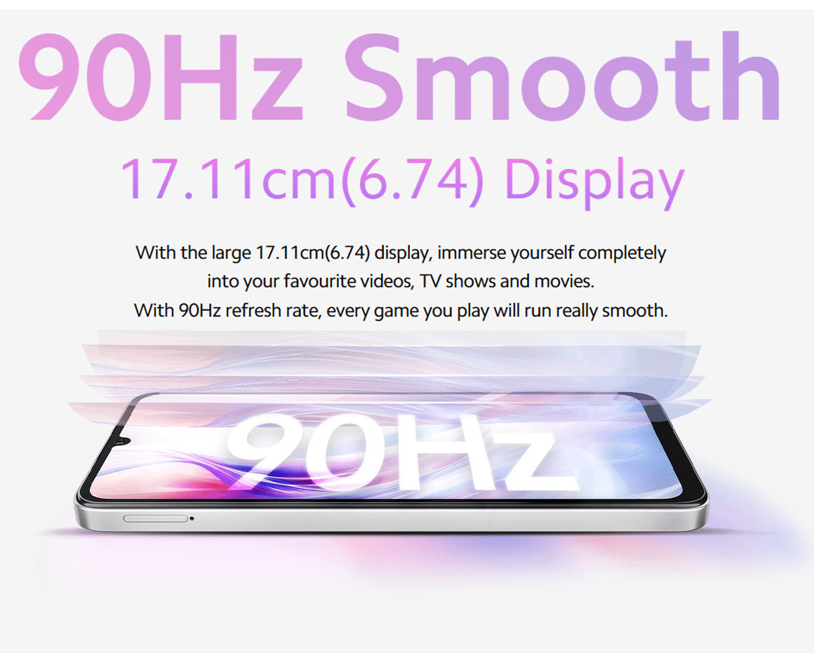 Experience visuals like never before on the 6.74-inch Dot Drop display with a resolution of 1600x720. The 260 ppi, combined with a refresh rate of up to 90Hz, brings your content to life with vibrant colours and seamless transitions. Immerse yourself in a world of vivid imagery that captivates your senses.
