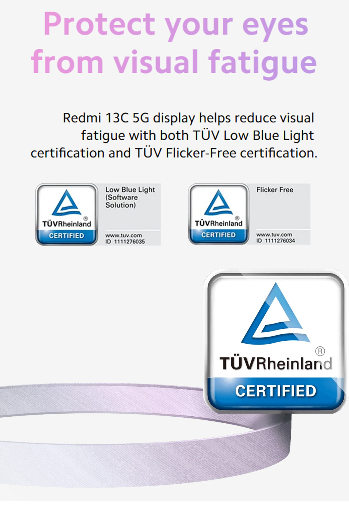 Take care of your eyes with T Æ’ … œV Rheinland Low Blue Light and Flicker-Free certifications. Whether you're engrossed in your favorite shows or working late into the night, the Redmi 13C smartphone prioritizes your eye health, ensuring a comfortable viewing experience without straining your eyes.