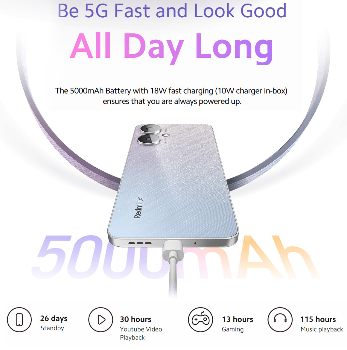 Stay seamlessly connected throughout the day with the substantial 5000mAh battery. Whether you're navigating the virtual or real world, the Redmi 13C smartphone has the power to keep up. And when it's time to recharge, the 18W PD Fast Charging ensures you spend less time plugged in and more time on the go.
