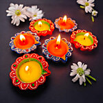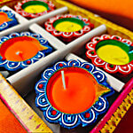 Detailed flower shape pattern design diya made from clay and filled with colorful wax.Diyas represent the triumph of light over dark and good over evil. The warm, bright glow emitted from a diya is considered auspicious, regarded to represent enlightenment, prosperity, knowledge and wisdom. The lighting of diyas forms a part of Diwali celebrations which marks the day Rama, Sita, and Lakshmana returned home to Ayodhya after 14 years in exile, after the defeat of Ravana. According to legends, to welcome Rama, Sita, and Lakshmana home, the citizens of Ayodhya are said to have lit up the streets with diyas.