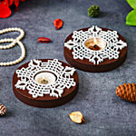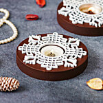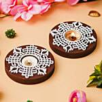 Elevate your festive decor with the eCraftIndia Set of 2 Brown & White Round Handcrafted Wooden Block Print Tea Light Candle Holders. Perfect for Diwali, Navratri, Ganesh Chaturthi, Christmas, weddings, parties, and birthdays, these tea light candle holders feature a unique handcrafted block print design that adds a touch of sophistication to any setting. Ideal for both indoor and outdoor use, these wooden tea light holders provide a warm, inviting glow. As stylish holders for tea lights, they complement your tea light candles and holders collection with elegance. Discover the perfect blend of tradition and contemporary design with these decorative tealight candle holders.