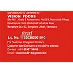 Manufactured & Marketed by: Vision Foods, Site No1, Khata & Assessment, No 55/8, Machohalli Village, Dasanapura Hobli, Kachohalli Industrial Area, Bangalore 562162, Bangalore Urban, Karnataka