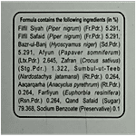 Filfil Siyah, Ajwain Khurasani, Filfil Safaid, Zafran, Sumbul-Ut-Teeb, Aqarqarha, Farfiyun, Shahad, Bazr Ul Banj, Afyun, Zafran, Jatamanshi, Qand Safeid, Sodium Benzoate