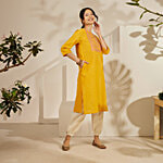 In vibrant yellow mangalgiri fabric, this a-line kurta exudes charm and elegance. Its round neck with a knoch adds a touch of grace, while the glass yoke adorned with intricate embroidery embellishments elevates its allure. The embroidery in indigo cotton thread and sequins imparts a sophisticated flair. The sleeves hem is delicately highlighted with indigo colour kantha stitch detailing, adding to its beauty. With 3/4 sleeves and pockets on both sides, it offers functionality with style.