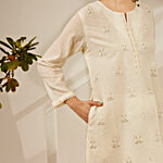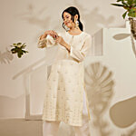 Introducing this off-white mul fabric kurta a timeless piece crafted for elegance and comfort. With a straight silhouette, it features a round neck adorned with embroidered off-white lace and an inverted box pleat at the center front. The front is embellished with self-color cotton thread embroidery, while the 3/4 sleeves are highlighted with ladder lace plaiting and cotton thread detailing at the hem. Complete with pockets on both sides, it's a perfect blend of sophistication and practicality.