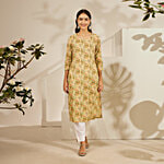 Introducing this knee-length straight kurta made from lightweight cambric fabric, this kurta is designed for comfort and style. Featuring an all-over printed pattern, a round neck with a notch detail, and 3/4 sleeves, it offers a blend of elegance. With its straight silhouette and knee-length design, it's perfect for any occasion, whether you're dressing up.