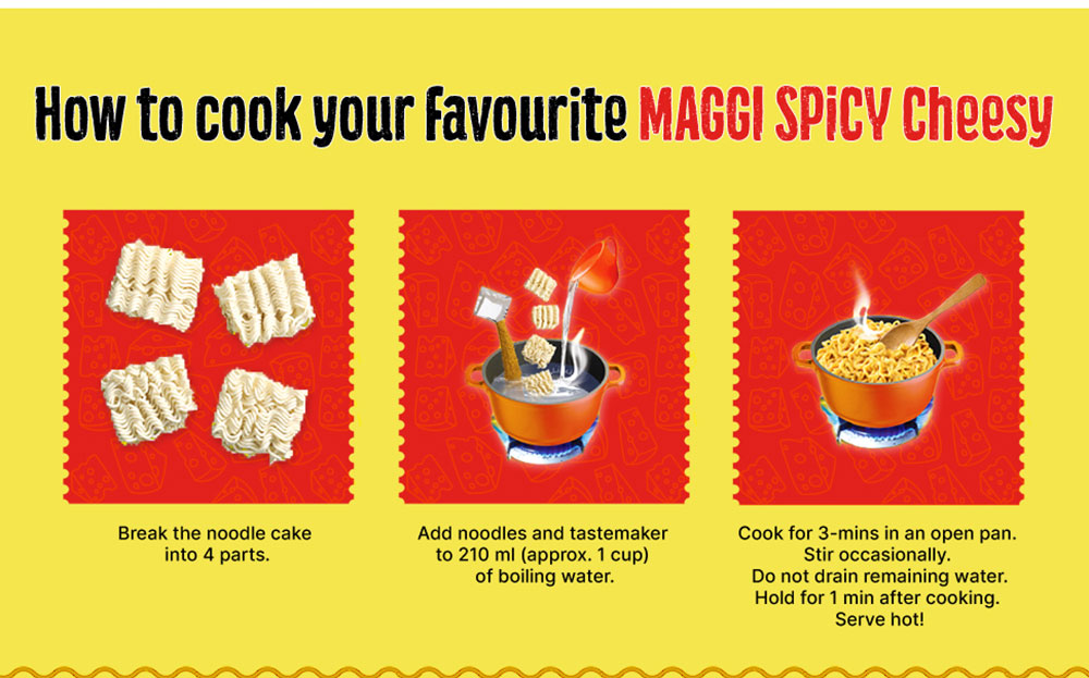 If you're craving a delicious twist on your classic MAGGI experience, look no further! MAGGI brings you Spicy Cheesy Noodles, where the rich flavour of cheese meets the beloved taste of MAGGI noodles. These instant noodles are perfect for satisfying your cravings for something spicy and delicious. Grab your forks and enjoy a delightful Spicy Cheesy twist anytime! Storage Instructions: Store in a cool, dry & hygienic place to protect from insects, pests & strong odours.