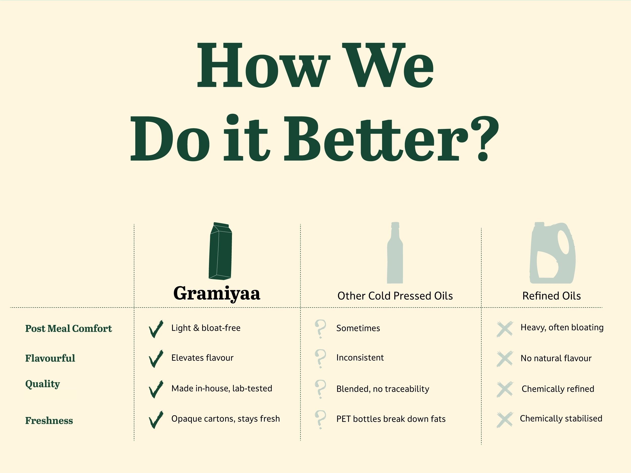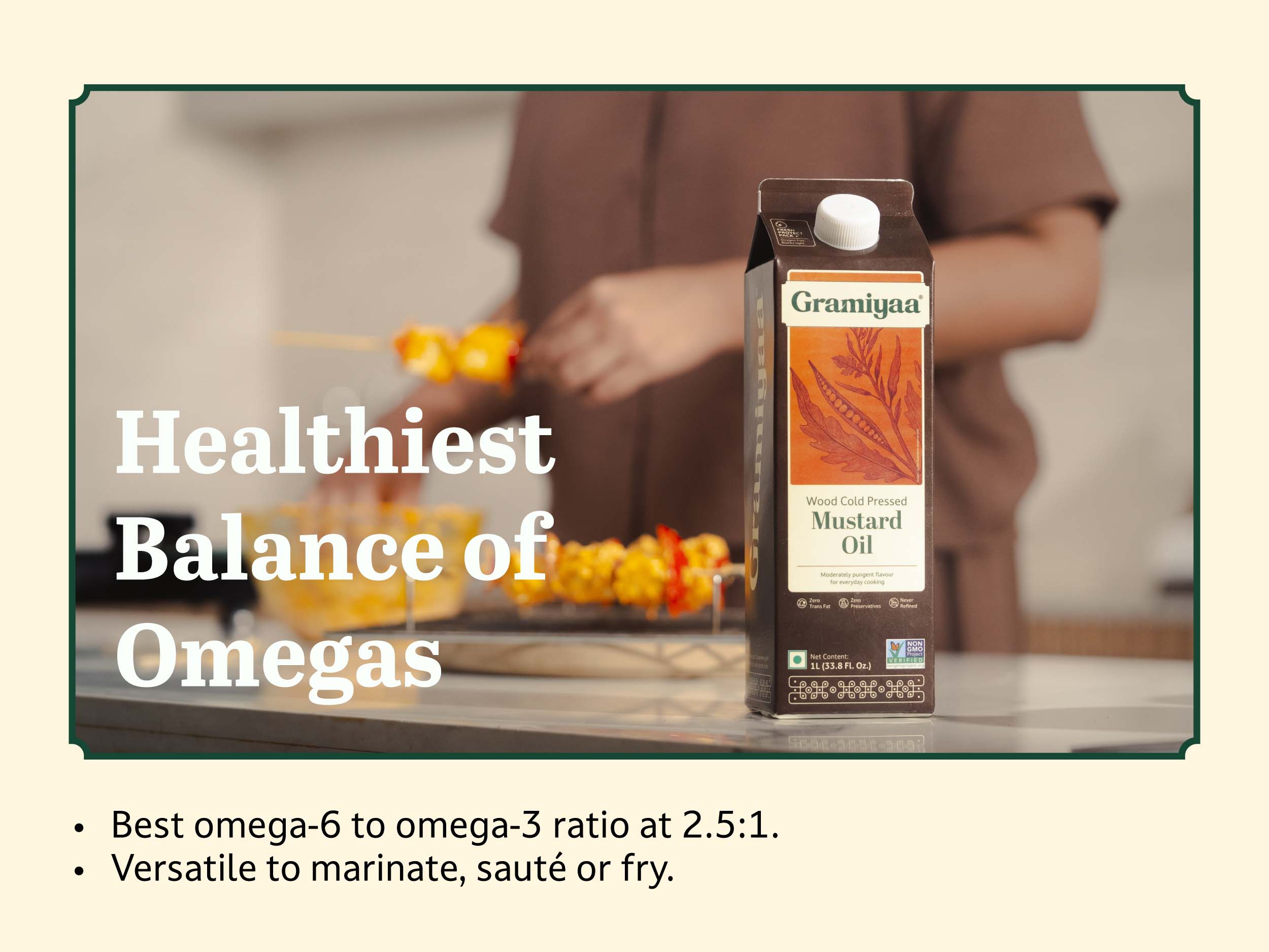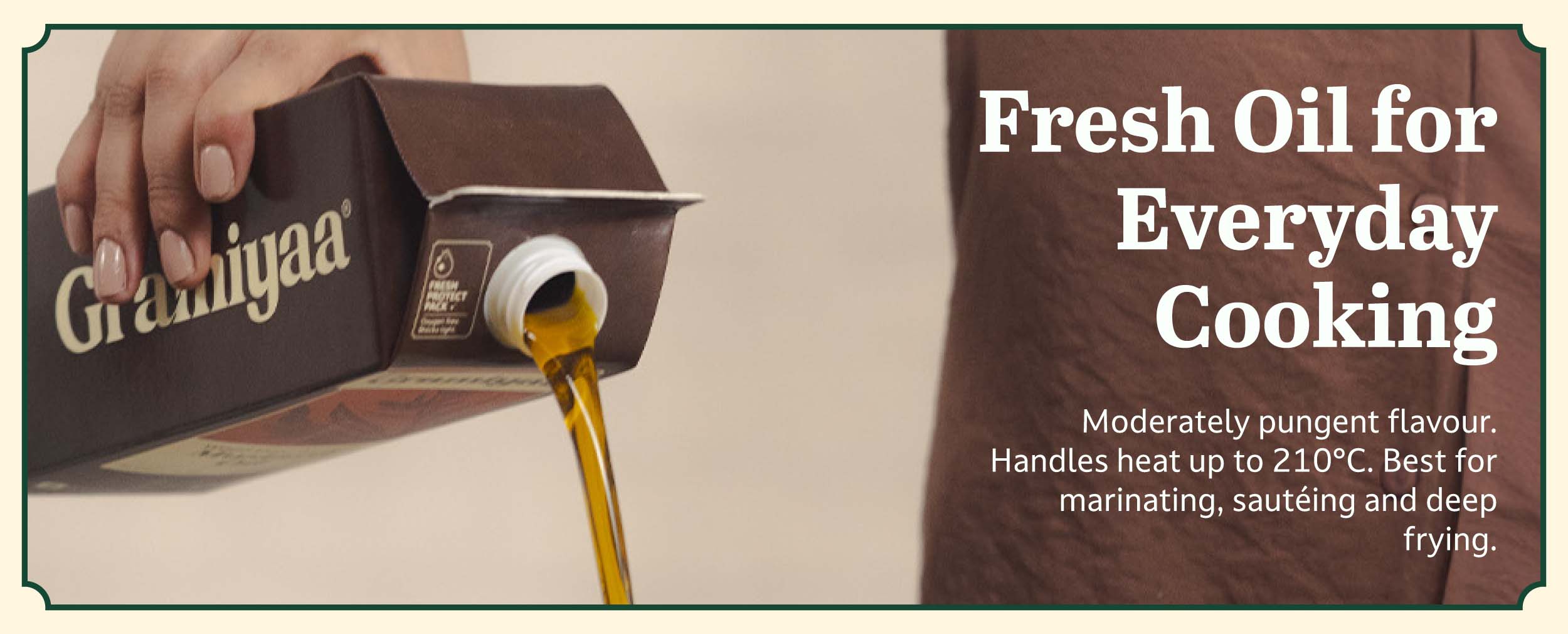 Discover the exceptional Gramiyaa's Wood Cold-Pressed Mustard Oil, crafted with meticulous care to deliver a bold, aromatic flavour and unparalleled health benefits. Sourced from sun-dried, non-roasted black mustard seeds, this oil is cold-pressed in traditional stone mills below 50°C to retain its natural nutrients. With a high smoke point of 250°C, it's the ideal companion for everyday cooking, adding a rich, earthy depth to your curries, pickles, and traditional recipes. Free from chemicals and trans fats, this oil aids digestion and promotes the absorption of essential nutrients, keeping your food light and flavourful. Packaged in opaque cartons, it stays fresh longer and is hygienically machine-packed, ensuring you enjoy the authentic taste and goodness of this artisanal oil.