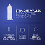 Extra Dots Condoms are designed with 576 raised dots for heightened stimulation and enhanced pleasure. Crafted from gold-standard latex, they feature natural lubrication and a comfortable teat end. Spermicide-free and electronically tested for reliability, these condoms ensure both safety and comfort. Conveniently packaged in discreet disposable pouches, they are perfect for those with a medium girth.