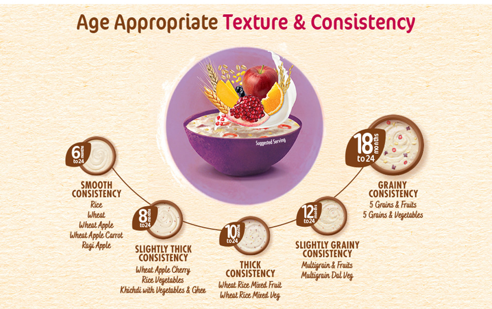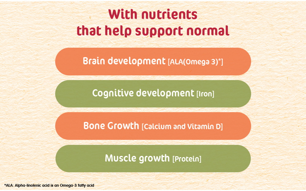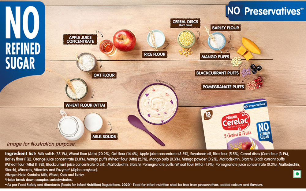 Milk Solids (35.1%), Wheat Flour (Atta) (20.9%), Oat Flour (14.4%), Apple Juice Concentrate (8.5%), Soyabean Oil, Rice Flour (5.5%), Cereal Discs (Corn Flour (3.1%), Barley Flour (1%)), Orange Juice Concentrate (3.8%), Mango Puffs (Wheat Flour (Atta) (2.1%), Mango Pulp (0.3%), Mango Powder (0.2%), Maltodextrin, Starch), Black Currant Puffs (Wheat Flour (Atta) (1.9%), Blackcurrant Juice Concentrate (0.3%), Maltodextrin, Starch), Pomegranate Puffs (Wheat Flour (Atta) (1.9%), Pomegranate Juice Concentrate (0.3%), Maltodextrin, Starch), Minerals, Vitamins And Enzyme* (Alphaamylase). Allergen Note: Contains Milk, Wheat, Oats And Barley.