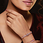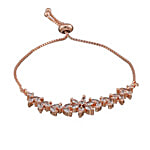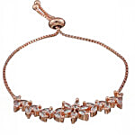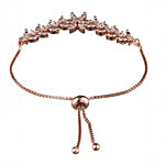 Elevate your style with this stunning rose gold and white link bracelet, crafted from premium brass. Embellished with sparkling American diamonds, it radiates elegance and sophistication. The sleek rose gold plating enhances its contemporary charm. Secured with a drawstring closure, it ensures both comfort and a perfect adjustable fit.