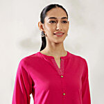 Add zest and zing to your look by wearing this pink kurta with pant from Daali. Tailored to sartorial perfection from premium quality fabric, it assures a soft and soothing touch against the skin. The mandarin collar augments its design. The three-quarter sleeves further speak for itself.