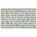 Water, Refined Soybean Oil (fortified with Vitamin A & D), Tandoori Seasoning (8%) (Maltodextrin, Spices & Herbs (Kasuri Methi, Chilli, Coriander, Cumin, Pepper, Cardamom, Ginger, Bayleaf, Cinnamon), Dehydrated Vegetables (Garlic, Onion), Dextrose, Natural and Nature Identical Flavouring Substances, Corn Starch, Anticaking Agent (551), Beetroot Juice Powder, Flavour Enhancers (627, 631)), Thickeners (1442, 1450, 412), Sugar, Natural Vinegar, Iodised Salt, Spices, Acidity Regulator (330), Natural and Nature Identical Flavouring Substances, Preservative (202), Sequestrant (385). May Contain traces of Soy, Wheat, Oats, Nuts, Mustard, Celery, Sulphite & Milk Products.