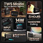 The high-performance speaker combines 14W powerful sound output and LED sunset projection lighting to deliver an immersive audio-visual experience, perfect for music, podcasts, or calls in any setting. With up to 5 hours of battery life, Bluetooth 5.3 connectivity, and True Wireless Stereo (TWS) functionality, it ensures seamless wireless pairing and extended entertainment. Its versatile charging options, including USB and Type-C fast charging, offer added convenience. The portable design, complete with a stylish leather handle, makes it ideal for on-the-go use, while hands-free calling and voice assistant compatibility enhance functionality and ease of use.
