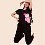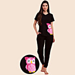 Clovia Owl Print 100% Cotton Top & Pyjama - Black, 1 Set (Size - L)