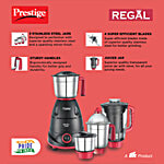 Experience efficient and effortless blending with the Prestige Regal 750W Mixer Grinder. Featuring a powerful 750-watt motor, it comes with three durable stainless steel jars and one transparent juicer jar, perfect for all your grinding and juicing needs. Its large capacity jars and sleek design ensure quick, convenient operation with a modern touch. Whether it’s spices, batters, or fresh juices, enjoy faster results in your kitchen every day.
