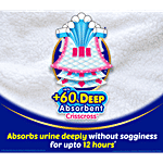 Among the finest in MamyPoko's history, these 'Best 12-hour Absorbent Pants' feature Deep Absorbent CrissCross technology and an additional third layer for superior urine absorption. They offer double protection against thigh leakage throughout the night, ensuring both baby and mother enjoy uninterrupted, dry sleep.