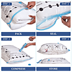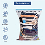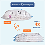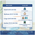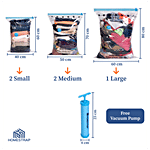 Homestrap Vacuum Compression Storage Bags allow you to save up to 4X more space. These airtight, reusable bags shield your clothes, blankets, and bedding from moisture, dust, and insects. This pack includes 2 Small bags, 2 Medium bags, 1 Large bag, and a free hand pump for effortless use – perfect for both home storage and travel.