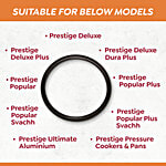 This gasket is suitable for a variety of Prestige aluminium pressure cooker models, including Deluxe, Deluxe Plus, Deluxe Dura Plus, Popular, Popular Plus, and Ultimate. For the Deluxe range, it is compatible with 7.5-litre, 8.5-litre, 10-litre, 11-litre, 12-litre, and 13-litre capacities. For Popular, Popular Plus, and Ultimate models, it fits 7.5-litre, 8.5-litre, 10-litre, and 12-litre sizes, ensuring broad usability across larger cooker variants.