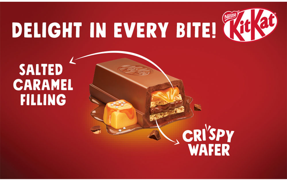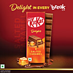 Experience the delight in every bite with KitKat Delights Salted Caramel. It has a gooey salted caramel filling inside, along with a signature crispy wafer coated in rich chocolate. The pack contains 1 unit of KitKat Delights Salted Caramel (112 g) in a 9-finger format. Unwrap, break, and bite into the indulgent layers of rich chocolate coating, creamy salted caramel filling with crispy wafers.