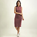 Miss Chase Maroon & White Cotton Striped Midi Bodycon Dress, 1 pc (Size - 34)