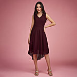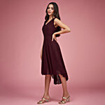 Miss Chase Wine Red Solid Midi High Low Style Dress, 1 pc (Size - 34)