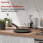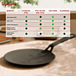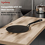 This 25.5 cm cast iron roti tawa is ideal for preparing chapatis, dosas, and other flatbreads, ensuring even heat distribution for consistent cooking results. Pre-seasoned with a naturally non-stick surface that improves over time, it allows for healthier cooking with less oil. Suitable for both gas and induction stoves, it offers flexibility for different kitchen setups. Crafted from premium-quality cast iron, the tawa is highly durable and retains heat effectively, making cooking more efficient. It also comes with a wooden spatula, designed for easy flipping and stirring while protecting the surface from scratches, ensuring long-lasting use.