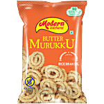Enjoy the rich and traditional taste of Modern Kitchens Butter Murukku, a crunchy South Indian snack made using a blend of rice flour, urad dal (black gram) flour, tapioca, and premium butter. Seasoned with sesame seeds, cumin seeds, and iodised salt, every bite is packed with flavour. Fried in rice bran oil, this snack is free from palm oil, trans fat, and gluten, making it a guilt-free indulgence.