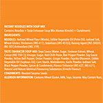 Taste Enhancer Soup Mix: Soya Sauce {Water, Sugar, Soybean Extract, Wheat, Colour (INS 150c)}, Vinegar, Sugar, Red Chilli Paste, Red Pepper Powder, Soy Sauce Powder, Yellow Bell Pepper, Onion Powder, Ginger Powder, Paprika Oleoresin, Edible Vegetable Oil (Soybean Oil), Corn Starch, Maltodextrin, Garlic Powder, Iodised Salt, Black Pepper Powder, Spices and Condiments, Flavour Enhancers (INS 627, INS 631), Natural and Nature-Identical Flavouring Substances (Kimchi Flavour).