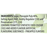 Sugar, Pineapple Pulp -48%, Gelling Agent (44), Acidity Regulator (33) and Preservative (211,224). CONTAINS PERMITTED SYNTHETIC FOOD COLOUR (12) AND ADDED FLAVOUR (ARTIFICIAL FLAVOURING SUBSTANCES-PINEAPPLE FLAVOUR)