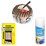 No Question askedDelish bake n choc Party Combo - Choco Dust Cake 500Gm, Magic Candles, Snow Spray