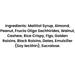Maltitol Syrup, Almond/Badam, Peanut, Fructo Oligo Saccharides, Walnut, Cashew/Kaju, Rice Crispy, Figs/Anjeer, Golden Raisins, Black Raisins, Dates, Emulsifier (Soy Lecithin), Sucralose. Allergy advice: Contains almonds, peanuts and soy.
