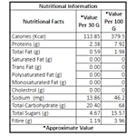 Values per 30g: Calories (Kcal): 113.85 Proteins (g): 2.38 Total Fat (g): 0.59 -Saturated Fat (g): 0.00 -Trans Fat (g): 0.00 -Polysaturated Fat (g): 0.00 -Monosaturated Fat (g): 0.00 Cholestrol (g): 0.00 Sodium (mg): 13.86 Total Carbohydrate (g): 20.40 Total Sugars (g): 4.67 Fibre (g): 1.19